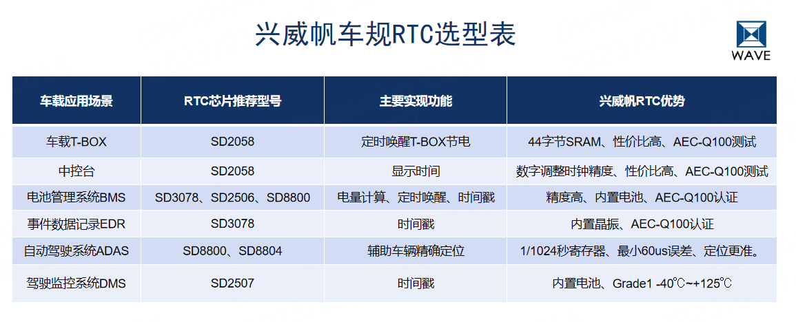 經(jīng)過(guò)十多年來(lái)的深耕,興威帆的車(chē)規(guī)級(jí)產(chǎn)品庫(kù)已經(jīng)有6顆,基本實(shí)現(xiàn)了對(duì)車(chē)載T-BOX、中控臺(tái)、電池管理系統(tǒng)(BMS)、事件數(shù)據(jù)記錄(EDR)、自動(dòng)駕駛系統(tǒng)(ADAS)、駕駛監(jiān)控系統(tǒng)(DMS)等汽車(chē)全場(chǎng)景覆蓋,可為客戶(hù)提供高精度、高可靠性、多樣化選擇的國(guó)產(chǎn)車(chē)規(guī)級(jí)RTC芯片。